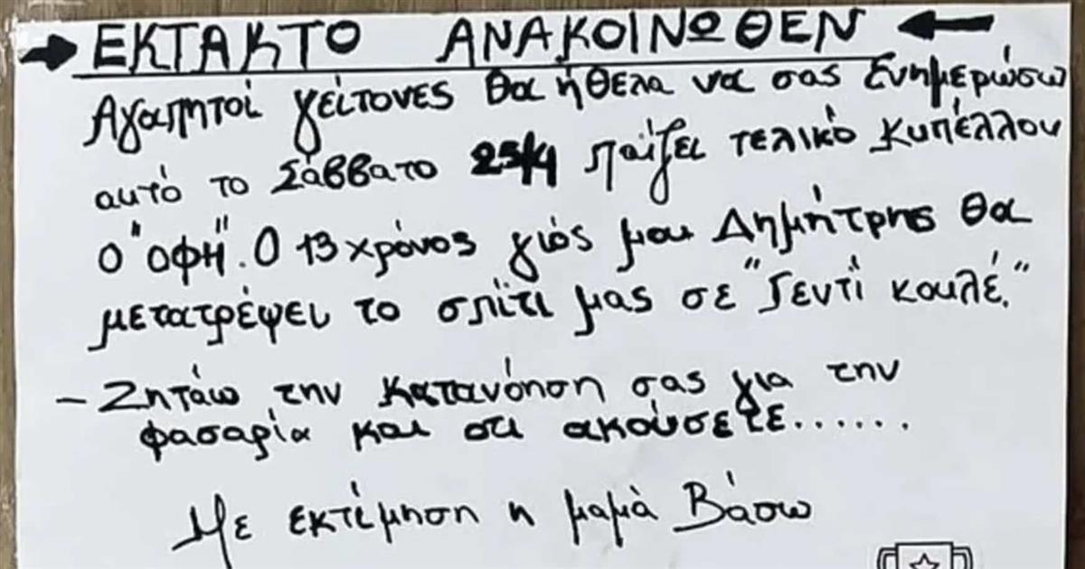Από ένα απλό χαρτάκι στην είσοδο πολυκατοικίας… έγινε viral σε όλη την Κρήτη μέσα σε λίγες ώρες.Ο τελικός του Κυπέλλου Ελλάδας ανάμεσα σε ΟΦΗ και ΠΑΟΚ δεν «παίζεται» μόνο στο γήπεδο, αλλά και… στα σπίτια των φιλάθλων, με έναν 13χρονο να ετοιμάζεται για βραδιά που δύσκολα θα ξεχαστεί.Στην περιοχή του Μασταμπά στο Ηράκλειο, μία μητέρα αποφάσισε να προειδοποιήσει εγκαίρως τους γείτονες για το τι πρόκ…